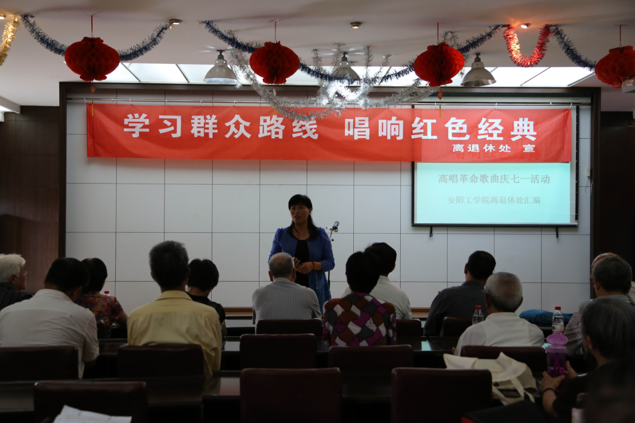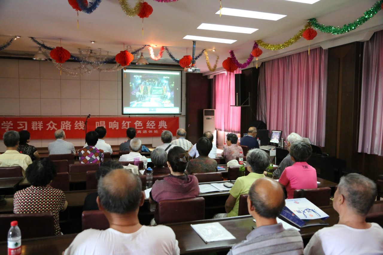 图为退休老干部唱红歌的场景