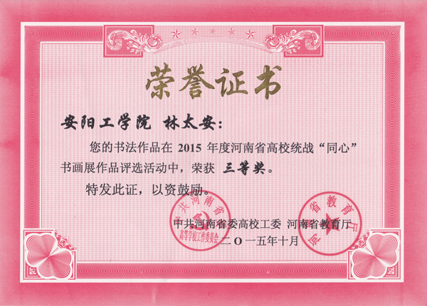 近日,我校林太安老师在2015年度河南省高校统战“同心”书画展作品评选活动中荣获书法类三等奖。此次活动由河南省教育厅开展,以“同心”思想为主题,参赛作品由主办方邀请书画艺术领域的专家组成评审委员会进行评审,活动分别设立书法和绘画一等奖、二等奖、三等奖及优秀组织奖。