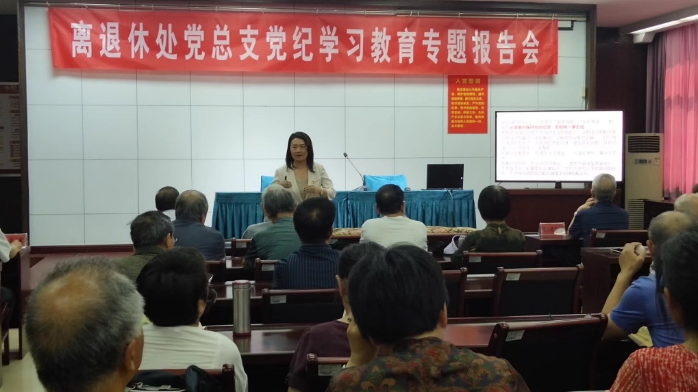党纪学习教育报告会上,马克思主义学院李伟老师以《<中国共产党纪律处分条例>专题学习》为题作报告,报告紧紧围绕为什么学《中国共产党纪律处分条例》、如何学《中国共产党纪律处分条例》两部分展开,她结合党的二十大报告和相关案例讲解,使全体党员受到一次深刻的党纪学习教育。离退休职工第一党支部书记黄立成以《严守“六大”纪律,争当讲纪律、守规矩的表率 》为题,从严守政治纪律、组织纪律、廉洁纪律、群众纪律、工作纪律和生活纪律六个方面,强调作为一名退休党员,要时时、处处严格要求自己,做讲纪律、守规矩的表率。