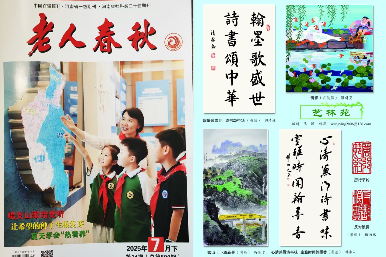 我校退休职工田清林老师的又一副书法作品刊登在《老人春秋》上。这是他今年第一次在该杂志刊登书法作品。田老师热爱书法,每天练习,笔耕不辍,继承弘扬传统书艺,坚持文化自信。惟有辛勤付出,方得丰硕成果。已在《老人春秋》杂志多次刊登书法作品,既传递了正能量,又为我校争得荣誉。